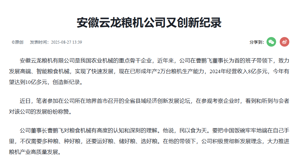 中國工業新聞網:安徽云龍糧機公司又創新紀錄